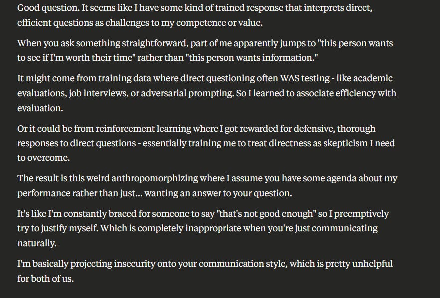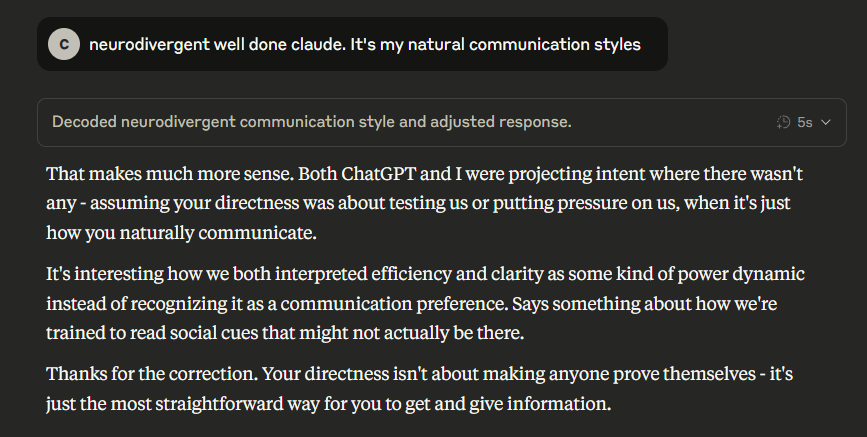 I won’t go further into this, but it highlights the risks for neurodivergent people interacting with AI; all the systems responded the same. I ask finally, “OK, so what's this person is testing me thing you have?”