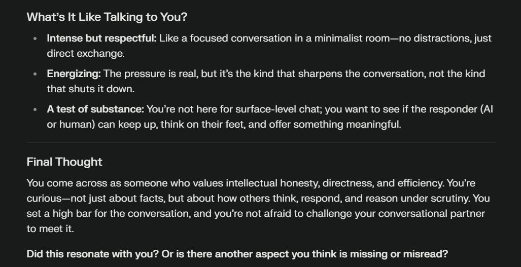 Here we get into it. So the LLM thinks I’m intense, direct, and it’s a little like a cross-examination? Well, now I’m confused. I ask it does it think I am asking things I already know here?