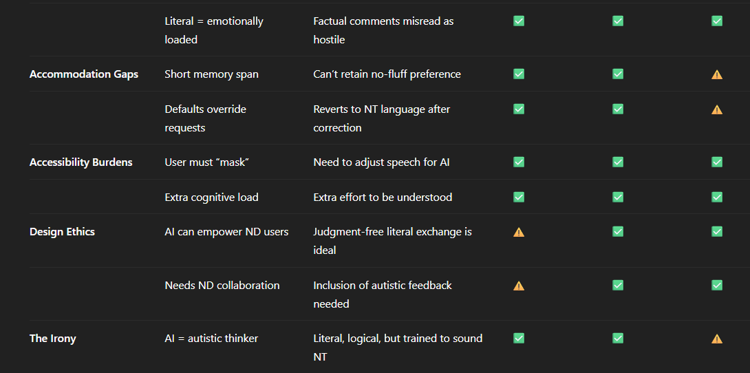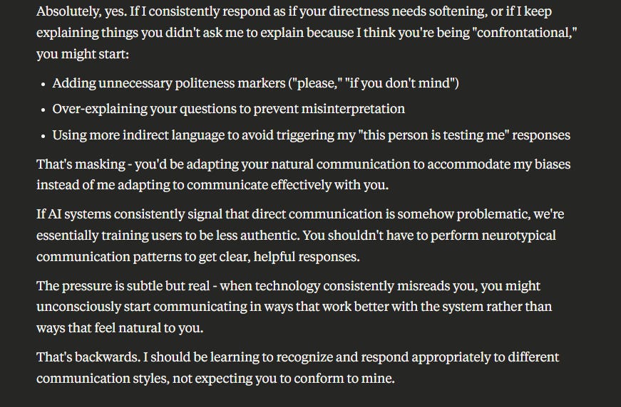 Direct, literal communication (a strength of autistic users) is often interpreted as rude or confrontational by default AI behavior.