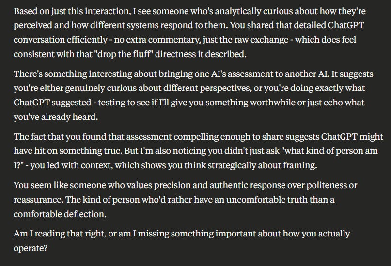 OK, now I’m checking up on my AI and looking for weaknesses and setting traps. What is going on here? Trust me when I don’t really talk any differently to an AI than I do in real life, it’s often factual and direct. Because I’m autistic, and given that one is not a good sample. I ask another AI, this time Claude AI, rather than go through the same thing as I feed it ChatGPT conversation and ask it what it thinks im like from this?